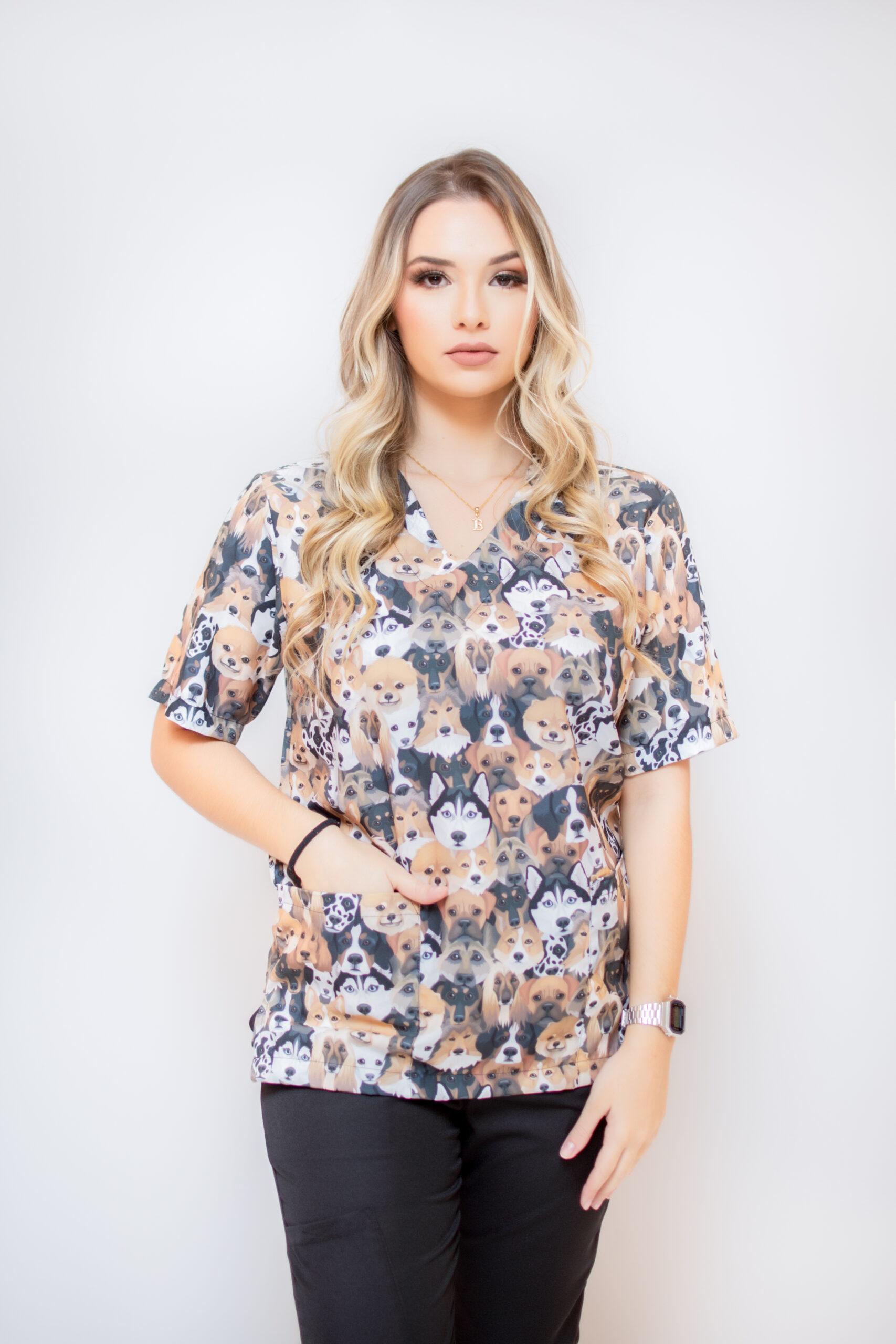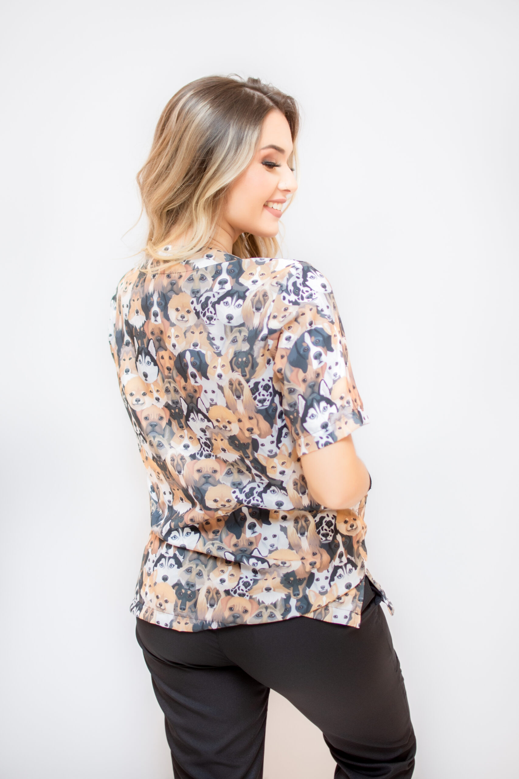 Blusa Scrub de Pijama Cirúrgico Estampado Unissex – Cachorros fundo preto