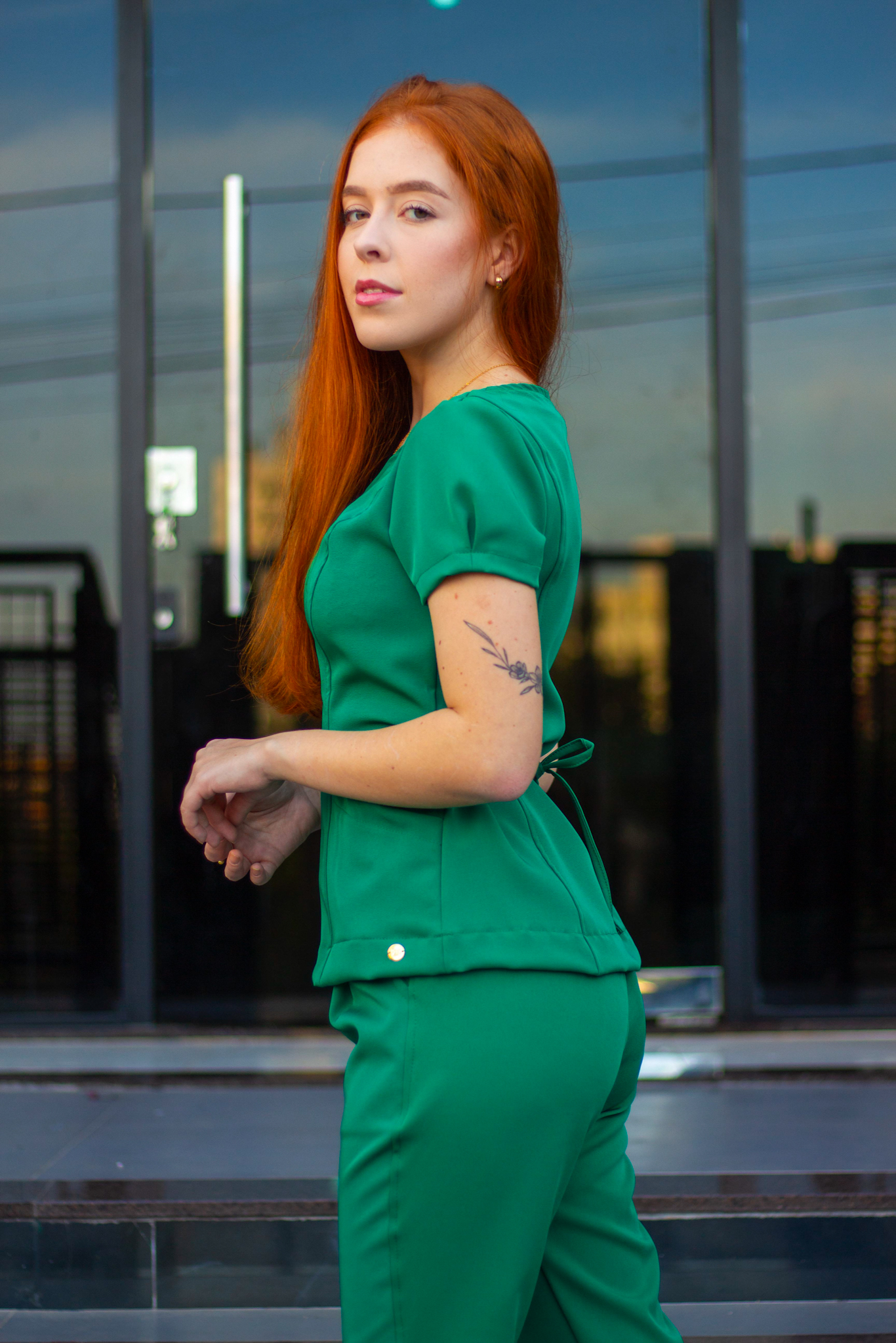 Blusa : Acinturada com amarações atrás e dois bolsos inferiores corte faca.
