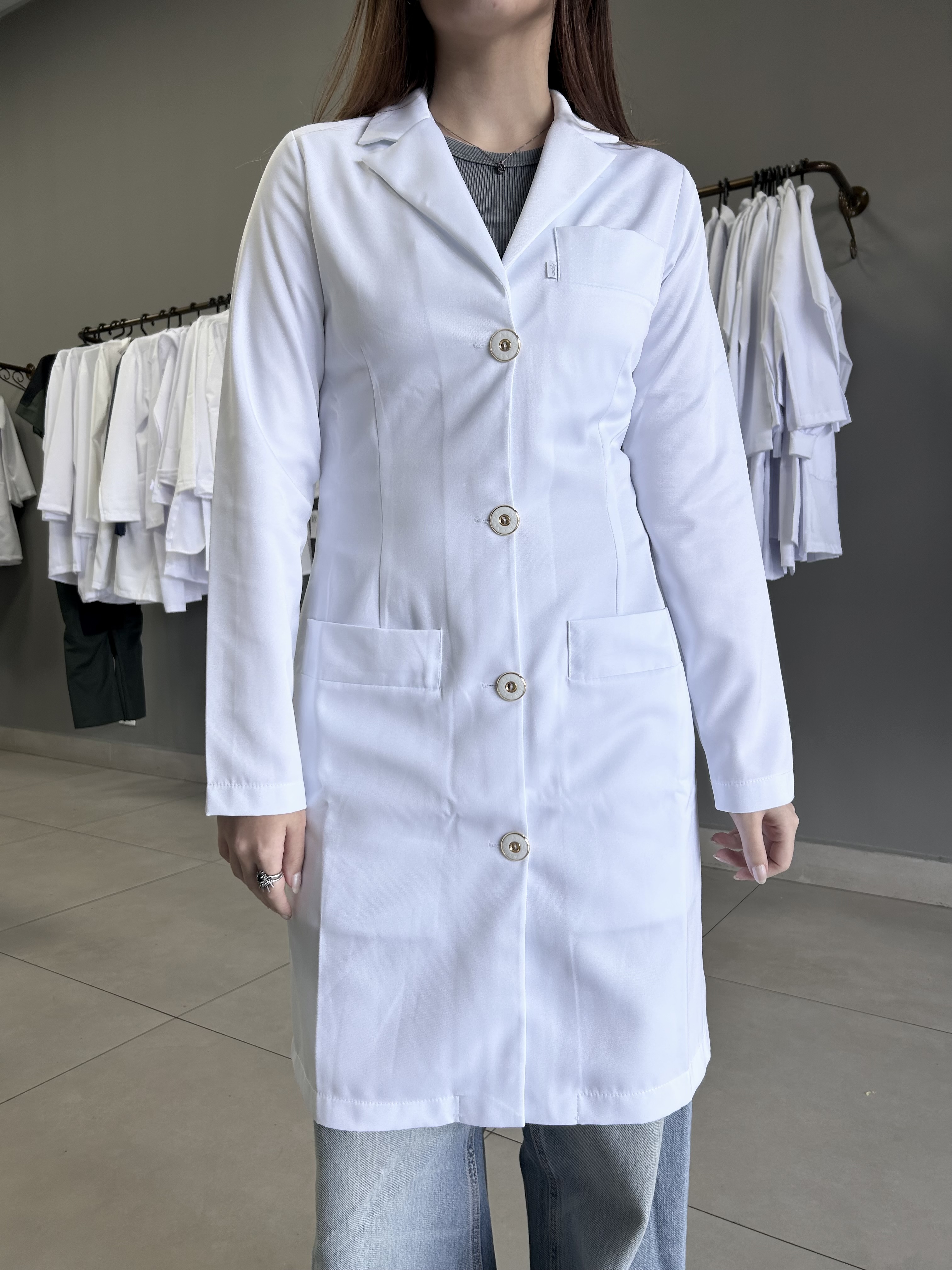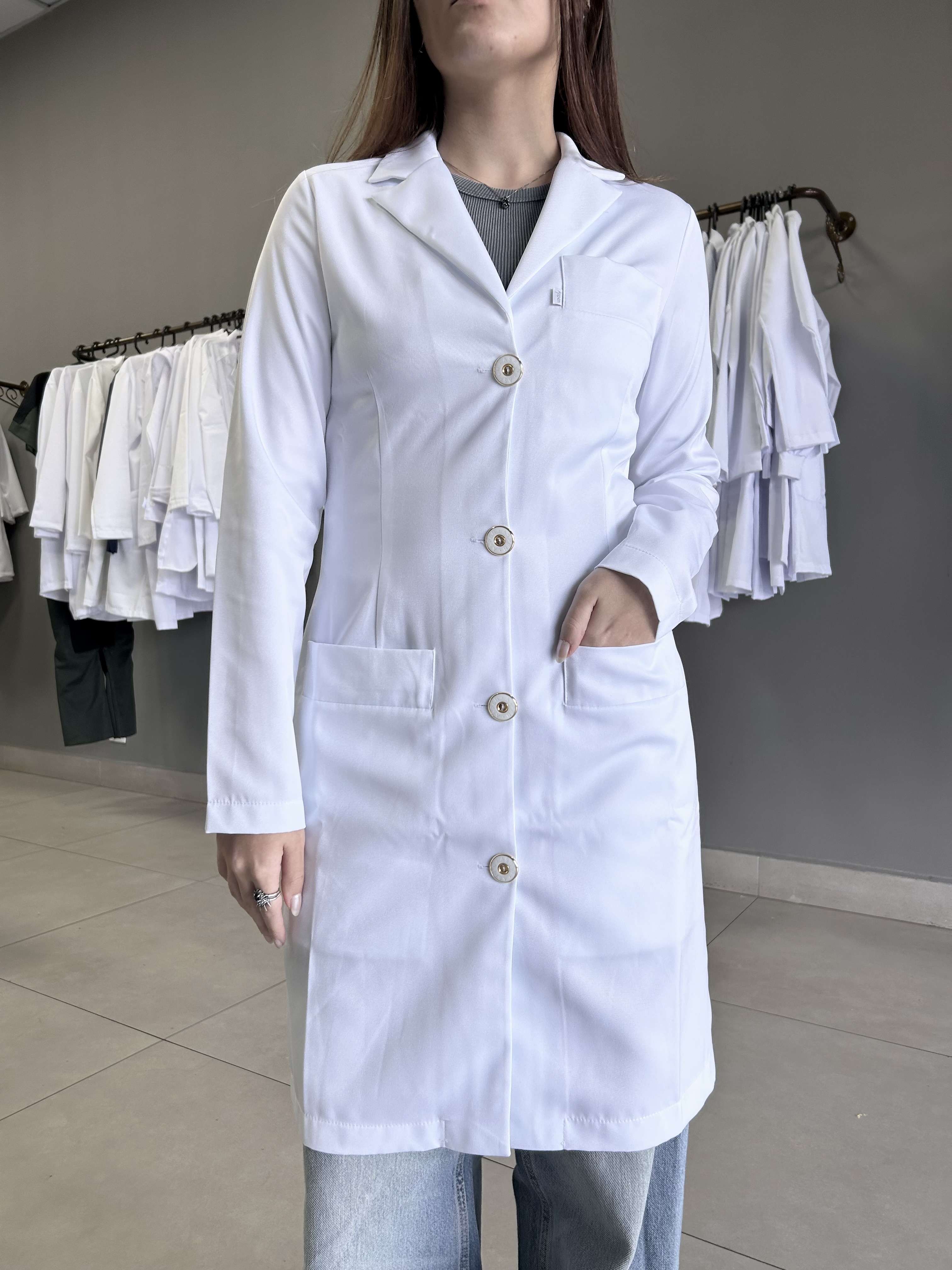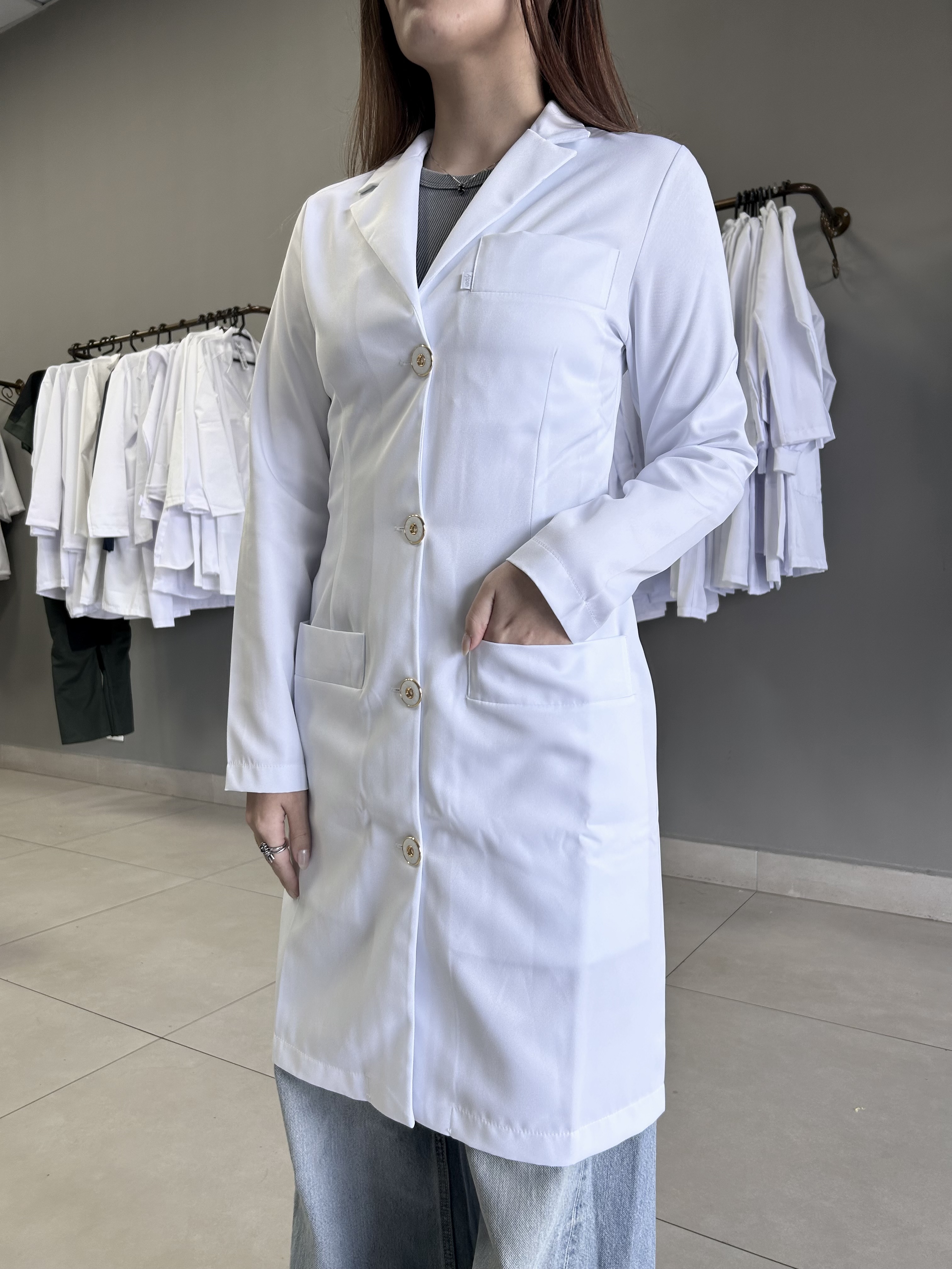 Jaleco Branco, Manga longa, Modelo acinturado, apresenta botões dourados, com 2 bolsos inferiores retos e 1 superior embutido, confeccionado em Gabardine microfibra pesada, tecido denso e encorpado agrega à peça um espetacular caimento no corpo, não amarela, é excepcional em acabamento, qualidade e durabilidade.