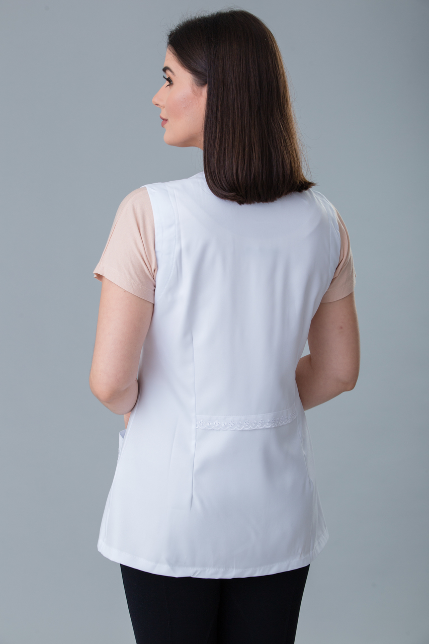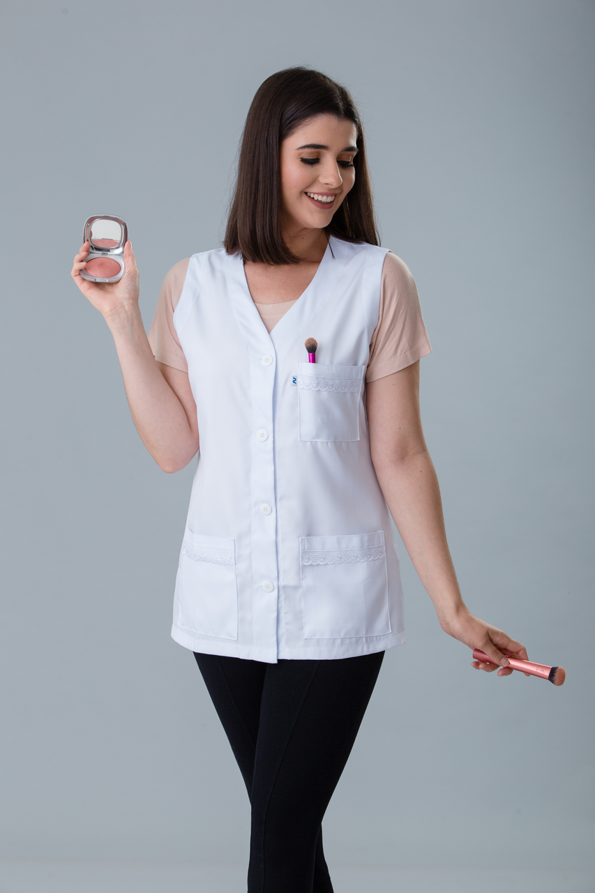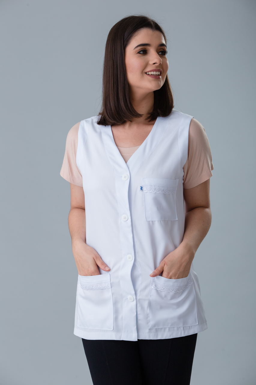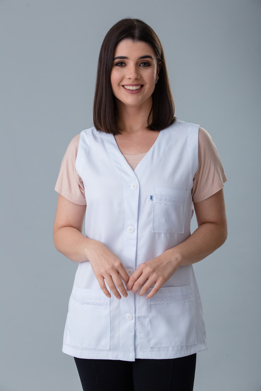 Jaleco cavado com detalhes de lese nos bolsos. Um modelo delicado com um caimento ótimo.