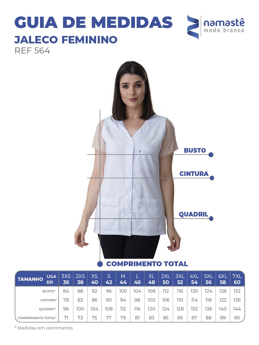 Jaleco disponível nos tamanhos: 36 ao 60 (consulte a tabela de medidas na última foto do anúncio para saber seu tamanho correto).