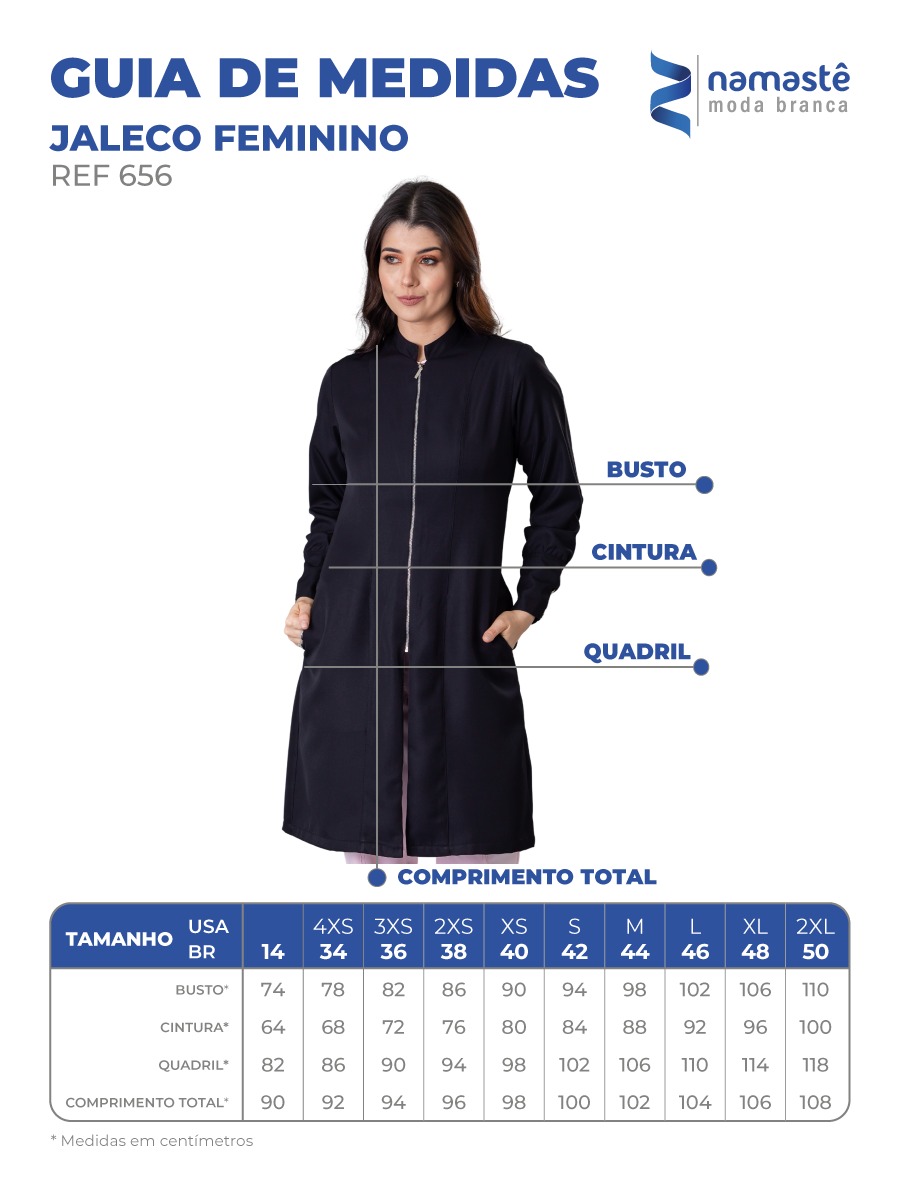 Jaleco disponível nos tamanhos: 36 ao 50 (consulte a tabela de medidas na última foto do anúncio para saber seu tamanho correto).