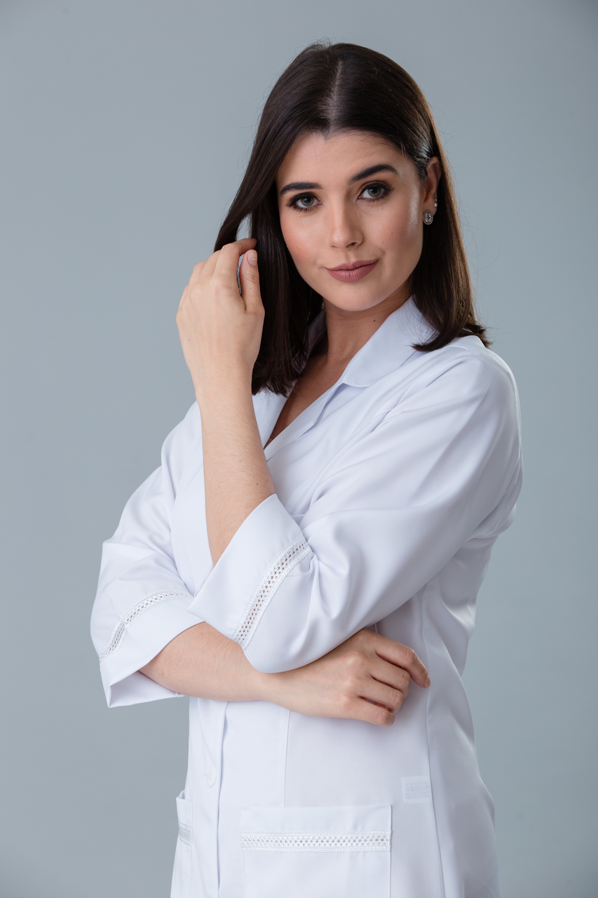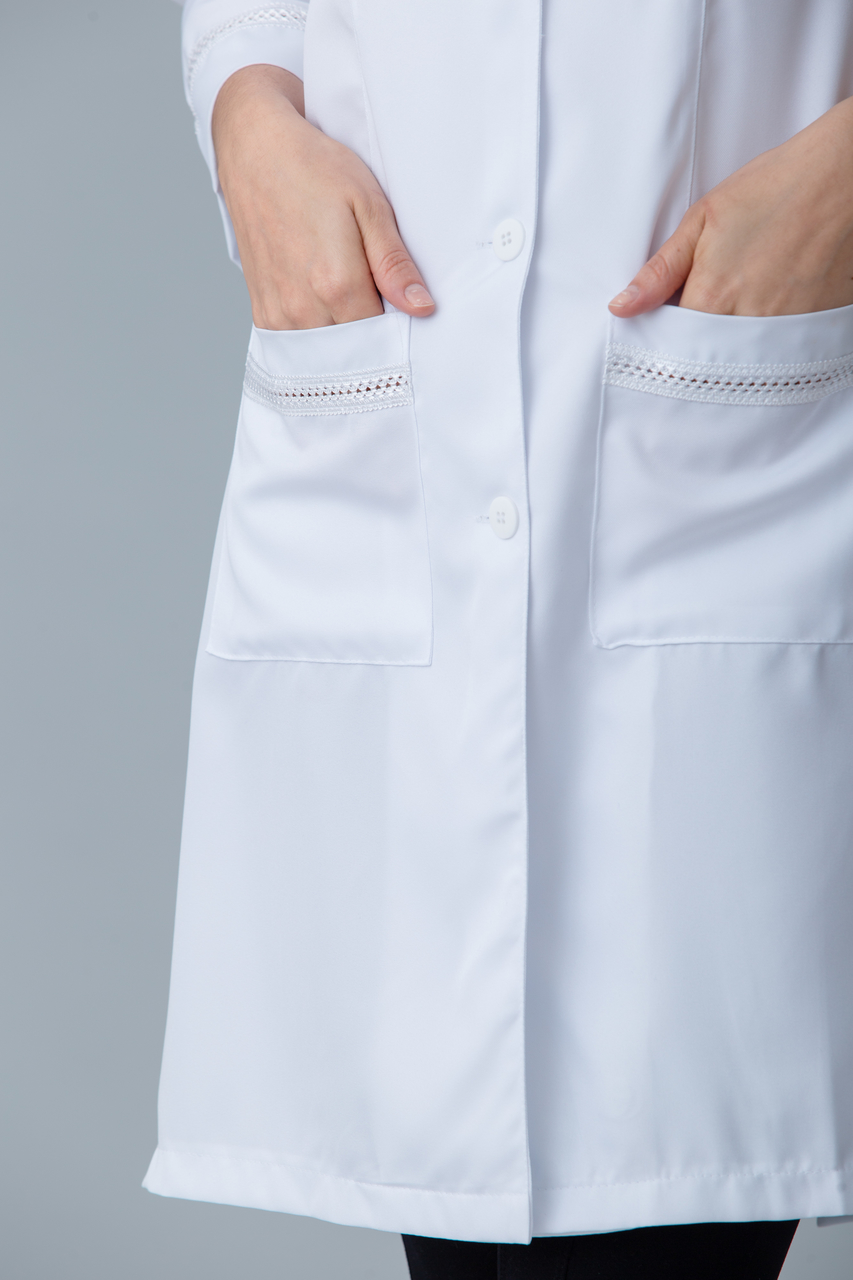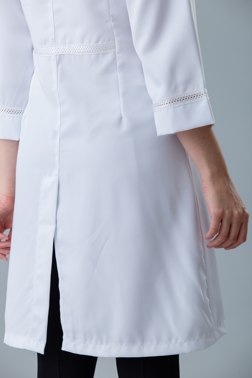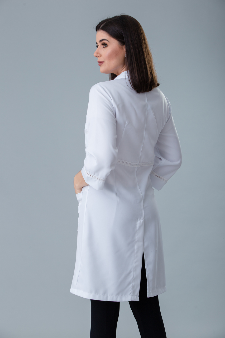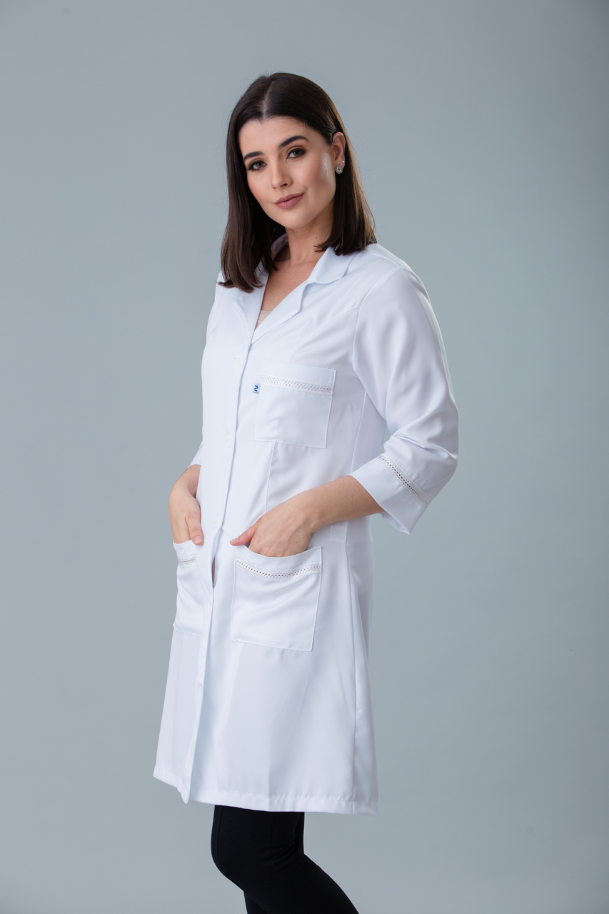 Nome Jaleco Feminino Branco Manga 3/4 Com Renda Nas Mangas e Bolsos Gabardine Alto Padrão Acinturado
