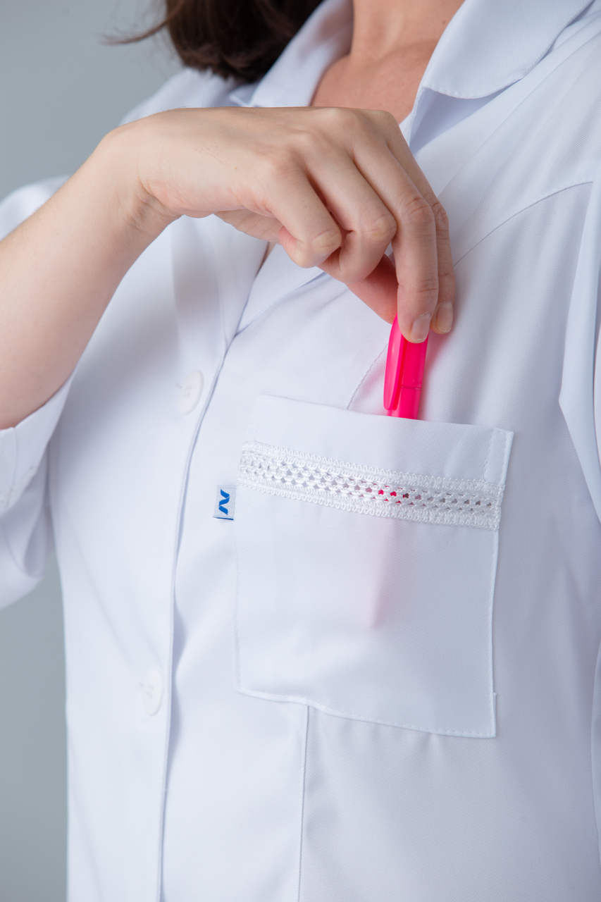 Um modelo com manga ¾ com detalhes de renda em poliamida nos bolsos e nas mangas, é elegante e delicado, não restringe nem atrapalha os movimentos.