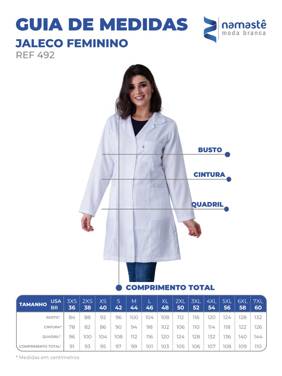 Jaleco disponível nos tamanhos: 36 ao 60 (consulte a tabela de medidas na última foto do anúncio para saber seu tamanho correto).