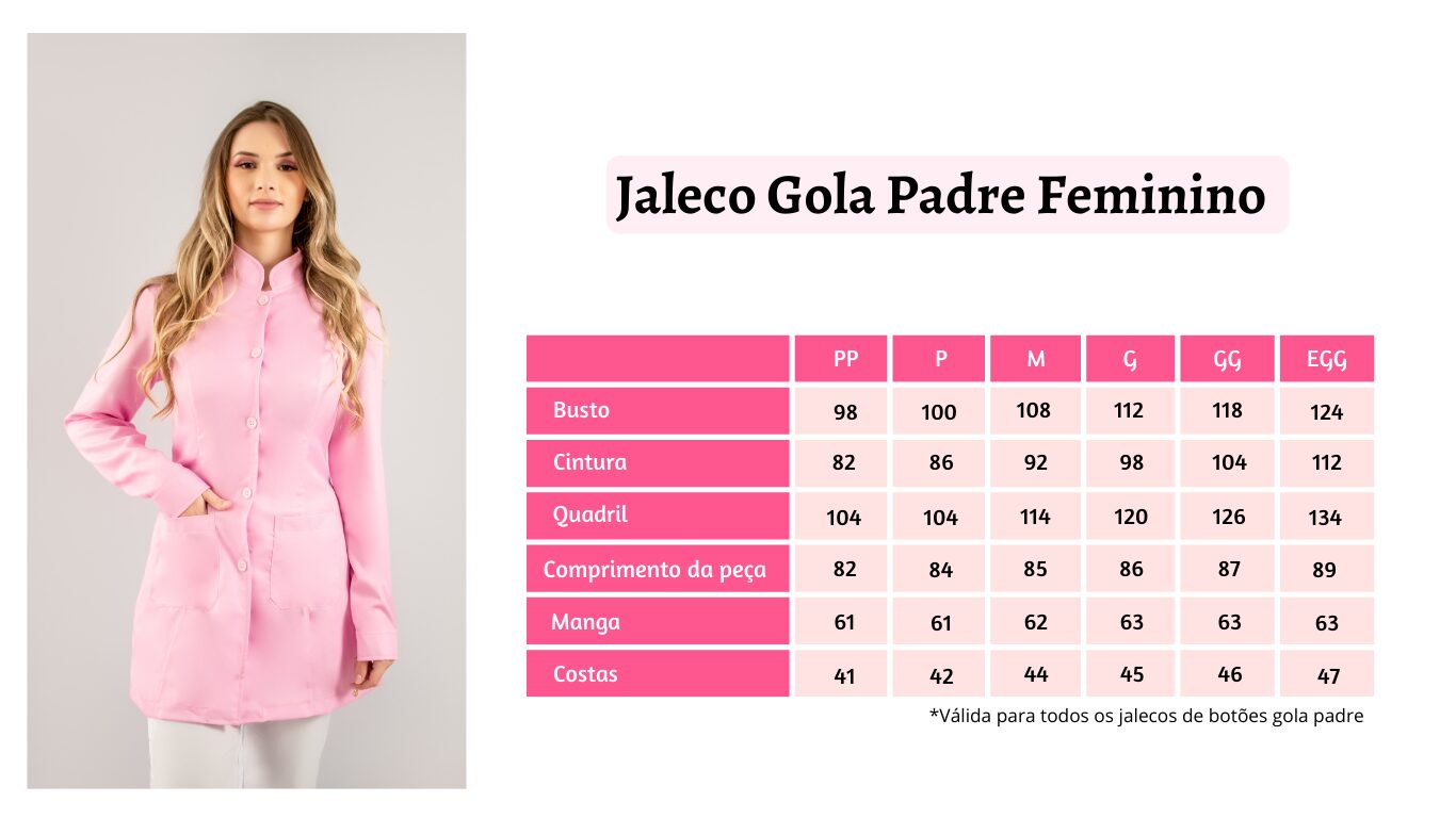 Jaleco disponível nos tamanhos: PP, P, M, G, GG, EG (consulte a tabela de medidas na última foto do anúncio para saber seu tamanho correto).