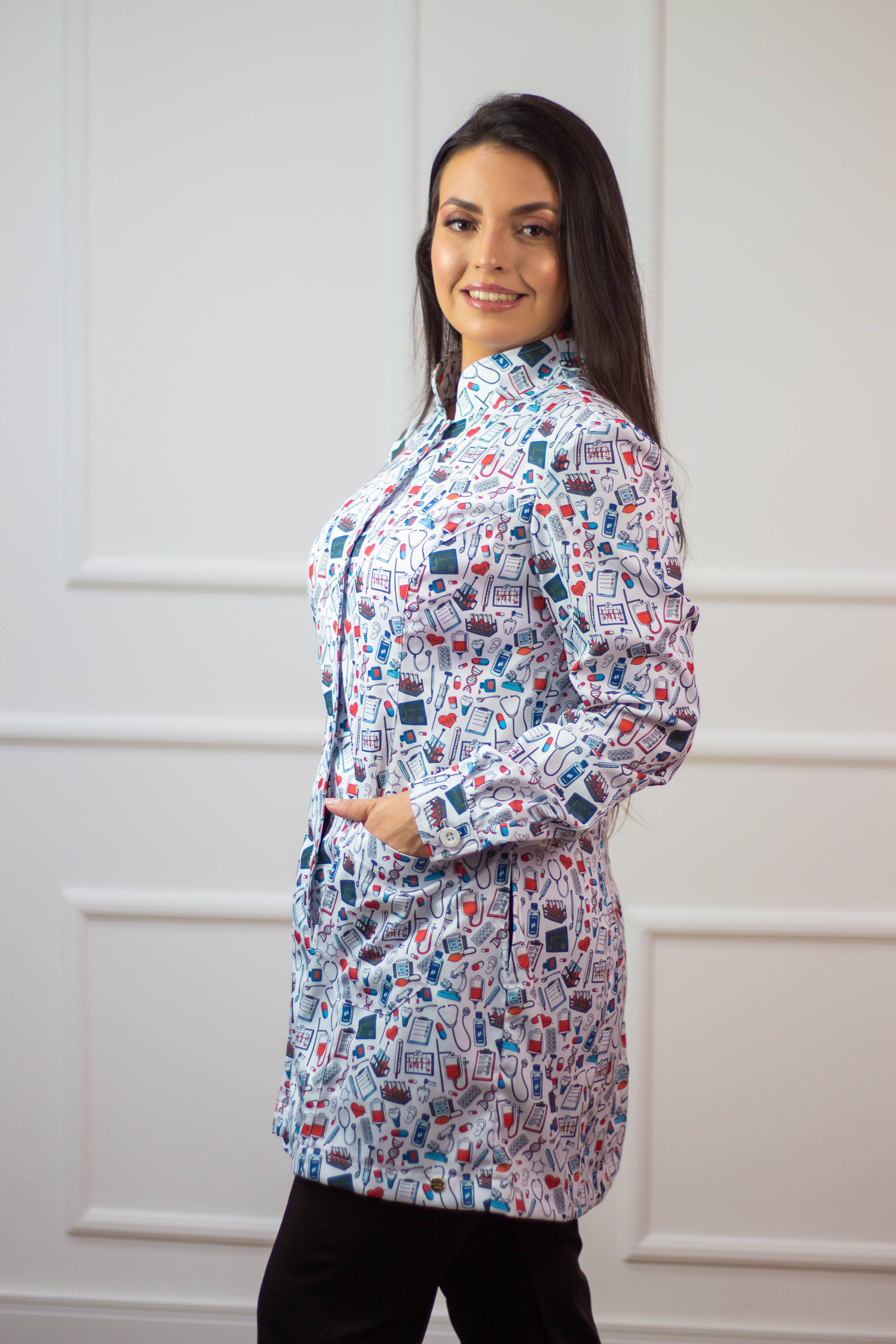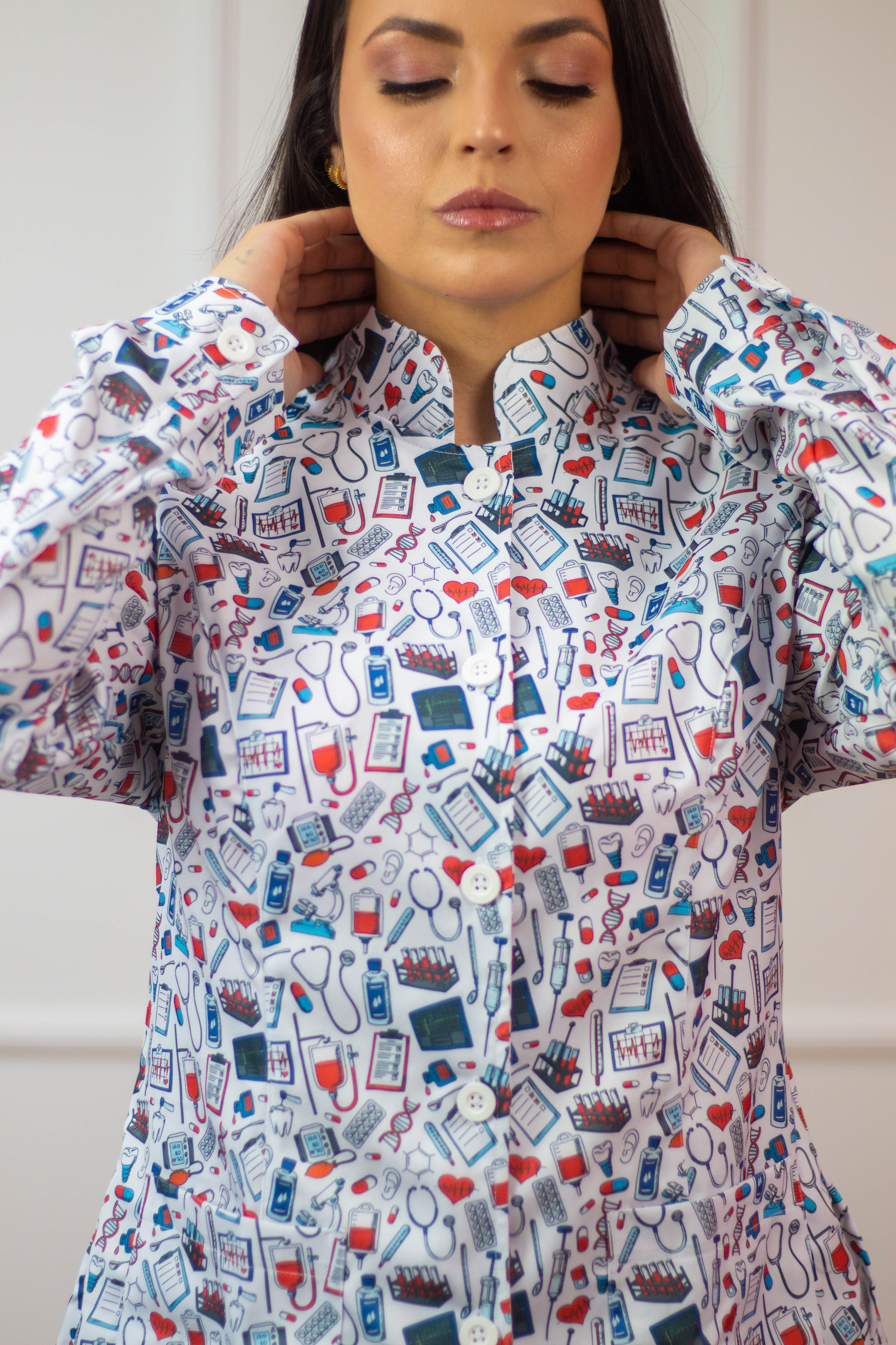 | Nome | Jaleco Feminino Estampado Utensílios Médicos Gabardine Gola Padre |