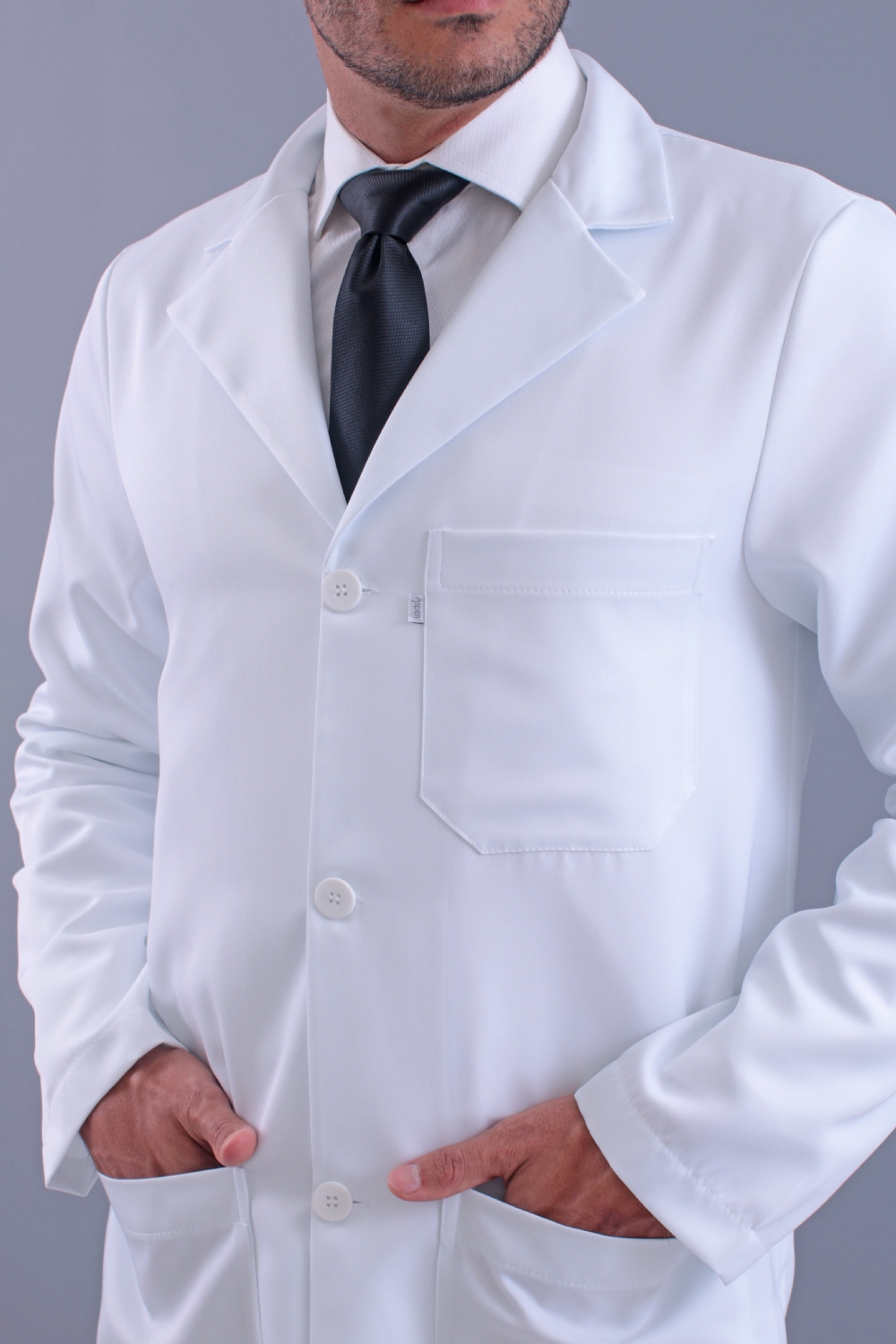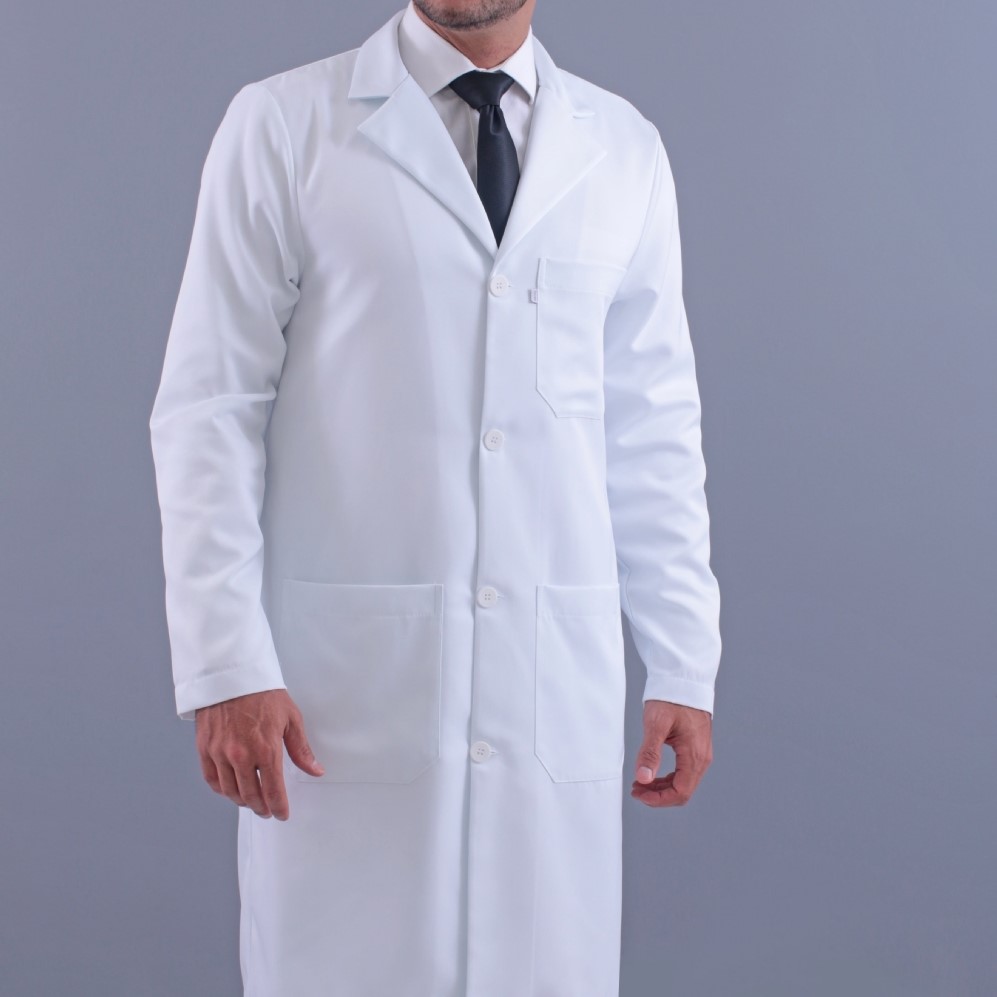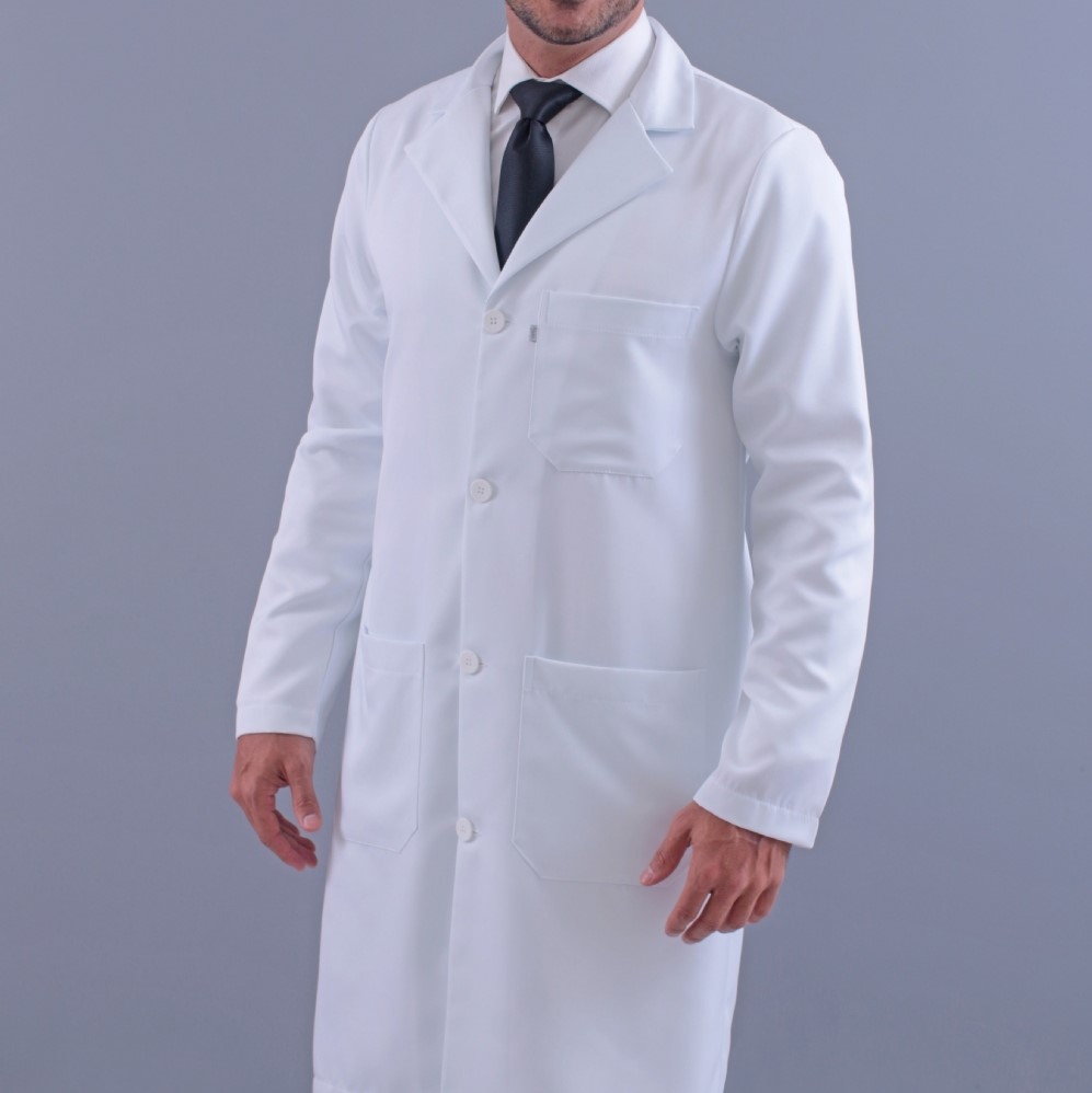 Jaleco Branco, Manga longa, Modelo reto, com 2 bolsos inferiores chapados e 1 superior, apresenta abertura em cada lateral localizada acima da cintura para utilização dos bolsos da calça, gola paletó, martingale diferenciado, confeccionado em Gabardine microfibra pesada, tecido denso e encorpado agrega à peça um espetacular caimento no corpo, não amarela, é excepcional em acabamento, qualidade e durabilidade.