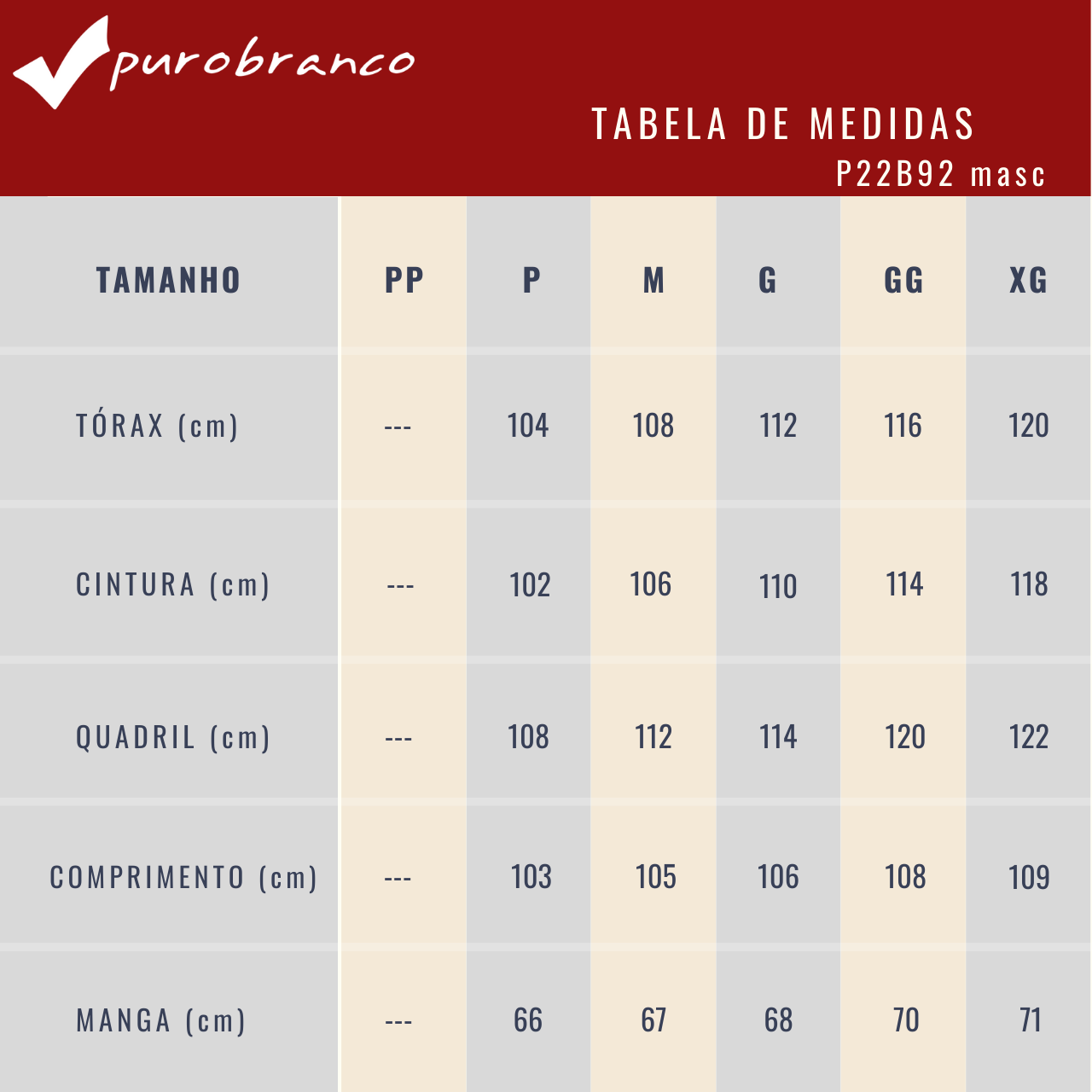 | Tamanho | PP, P, M, G, GG, EGG |