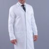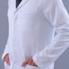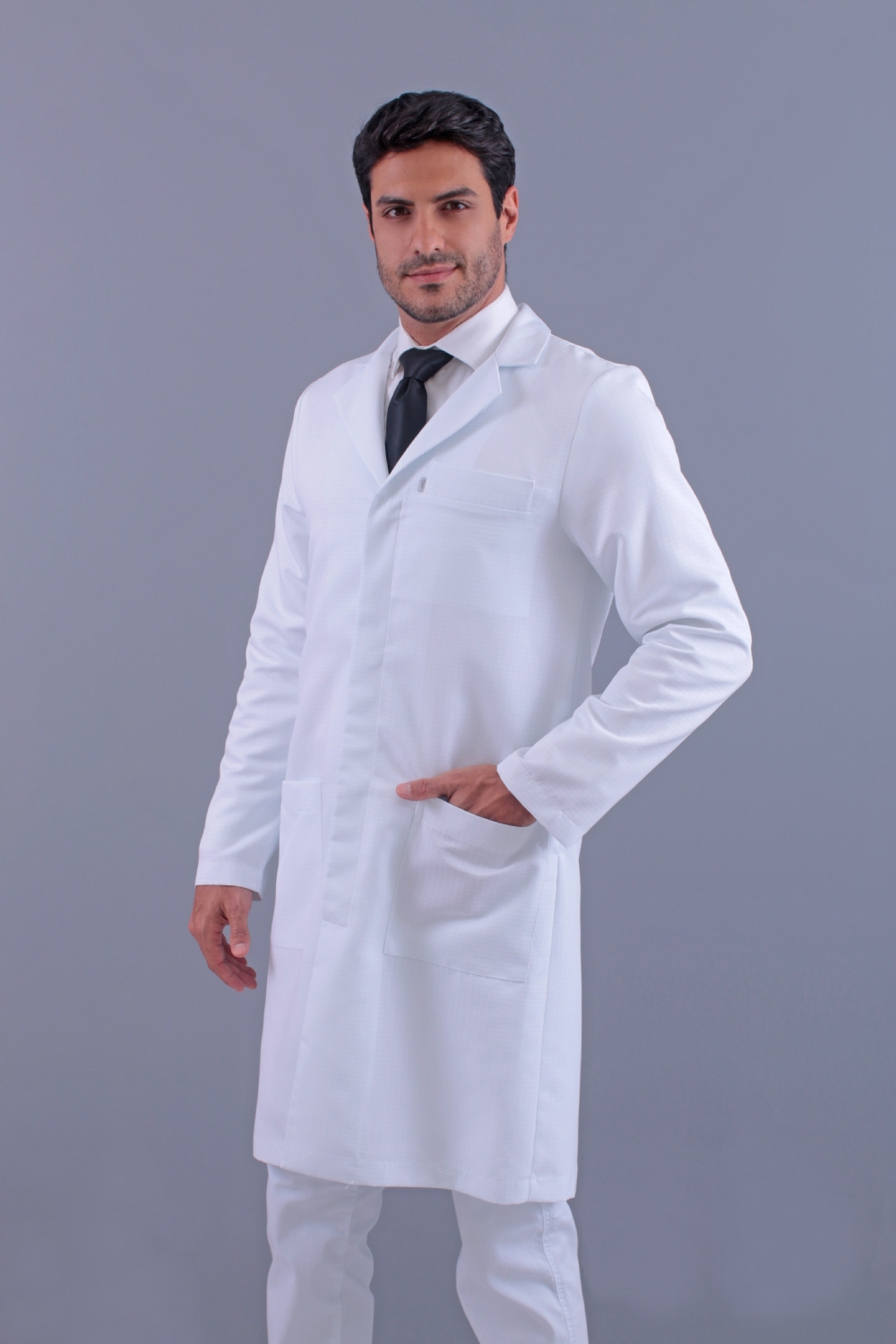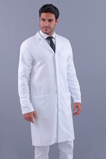Jaleco Branco, Manga longa, Modelo reto, com 2 bolsos inferiores retos e 1 superior embutido, apresenta abertura em cada lateral localizada acima da cintura para utilização dos bolsos da calça, confeccionado em Gabardine microfibra pesada, tecido denso e encorpado agrega à peça um espetacular caimento no corpo, não amarela, é excepcional em acabamento, qualidade e durabilidade.
