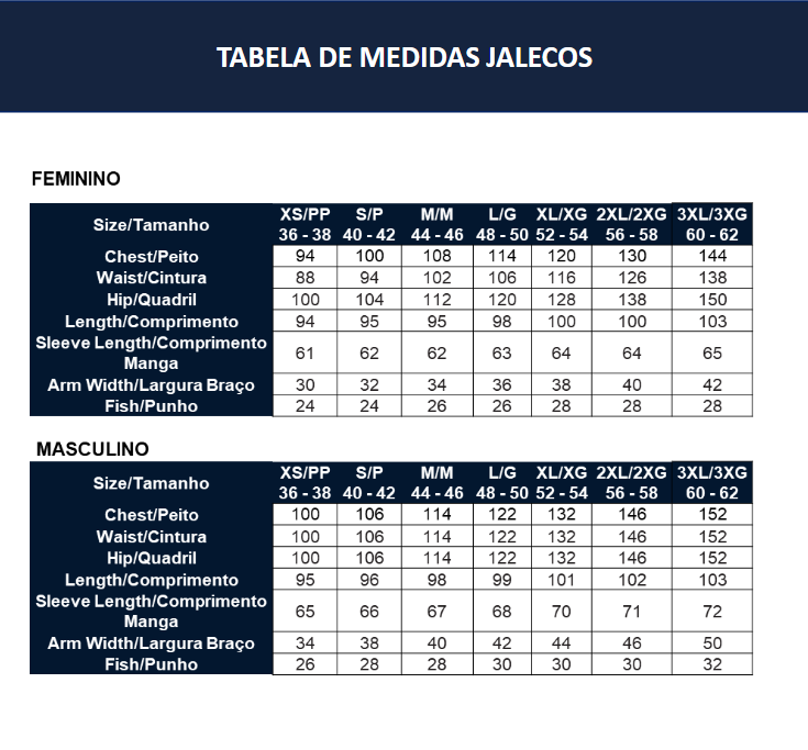 Jaleco disponível nos tamanhos: XS ao 3XL (consulte a tabela de medidas na última foto do anúncio para saber seu tamanho correto).