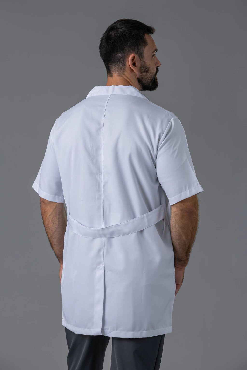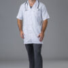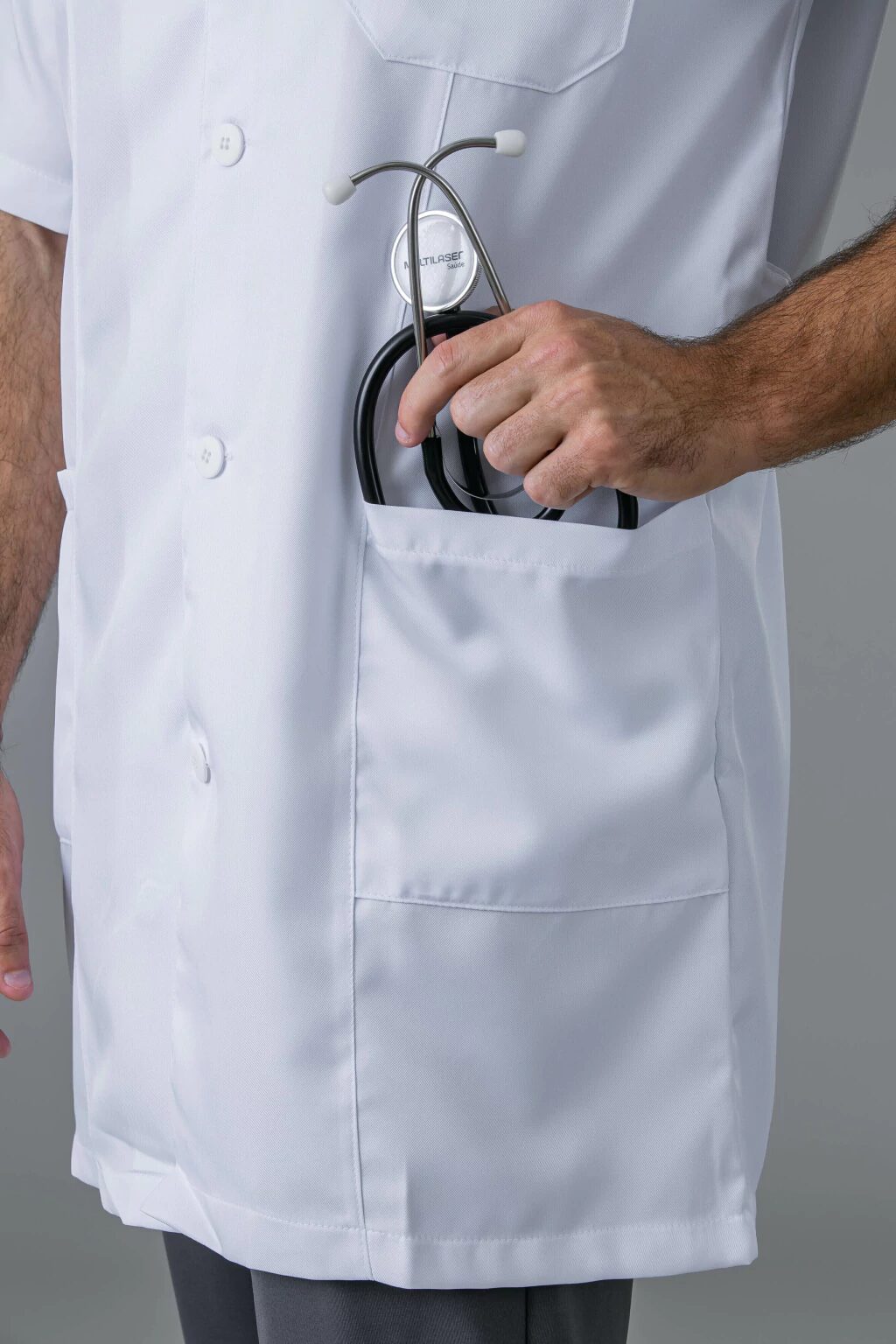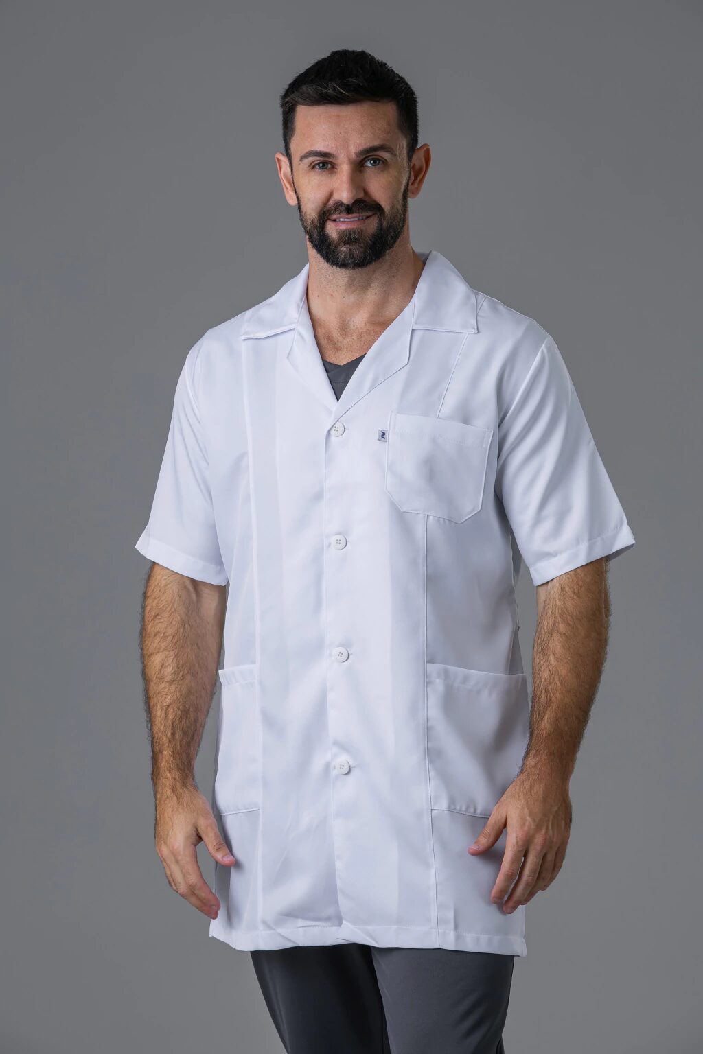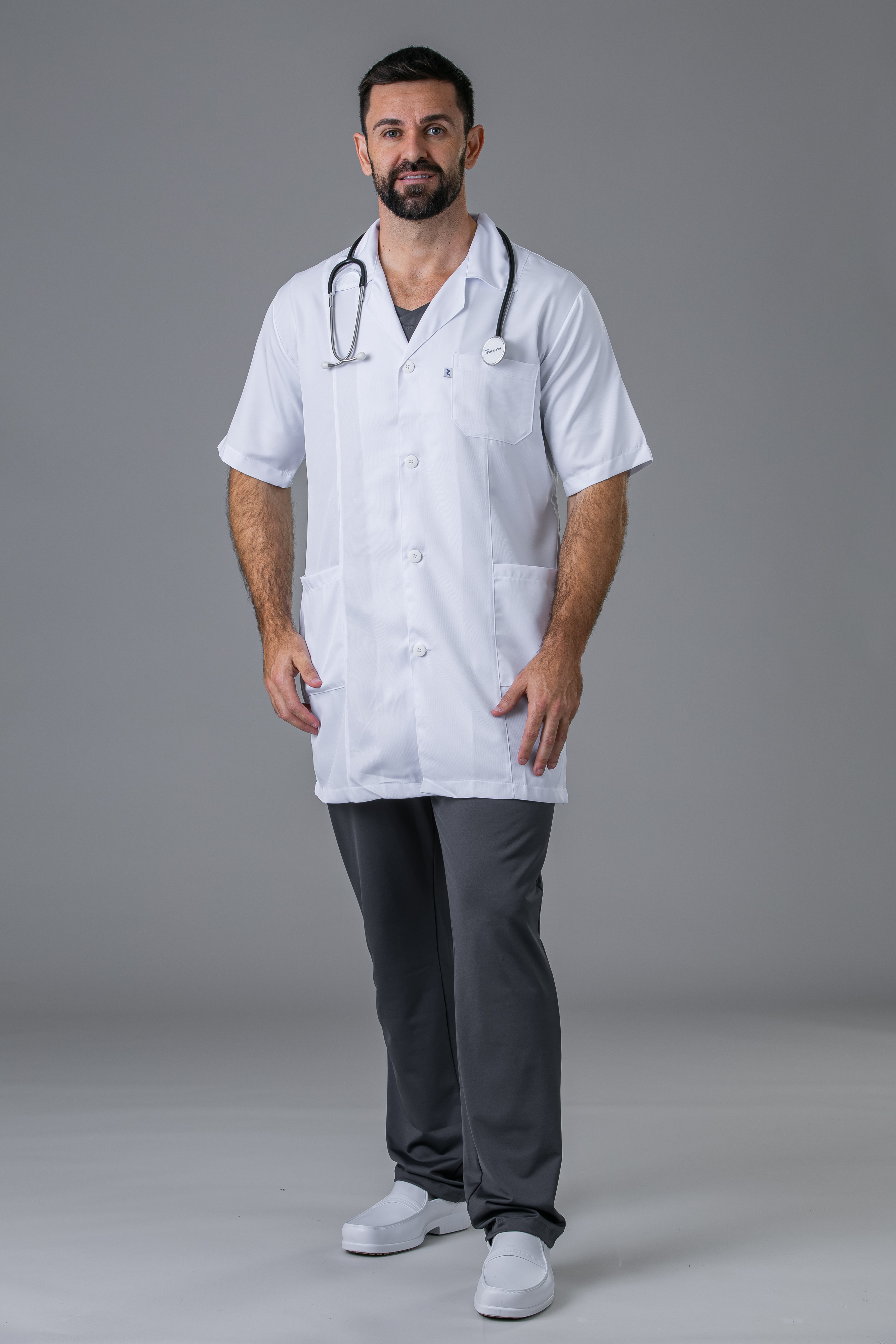 Um jaleco básico e unissex para ser usado tanto por homens quanto mulheres. Modelo manga curta com dois bolsos inferiores e um superior. Tecido de gabardine, que apresenta resistência e caimento impecável, eleva a experiência de uso, garantindo um visual sofisticado e profissional. Seja você um profissional da saúde, da área de beleza ou de qualquer outra área que demande vestimentas profissionais, nossos jalecos são a escolha perfeita para quem busca aliar estilo, conforto e praticidade no ambiente de trabalho.